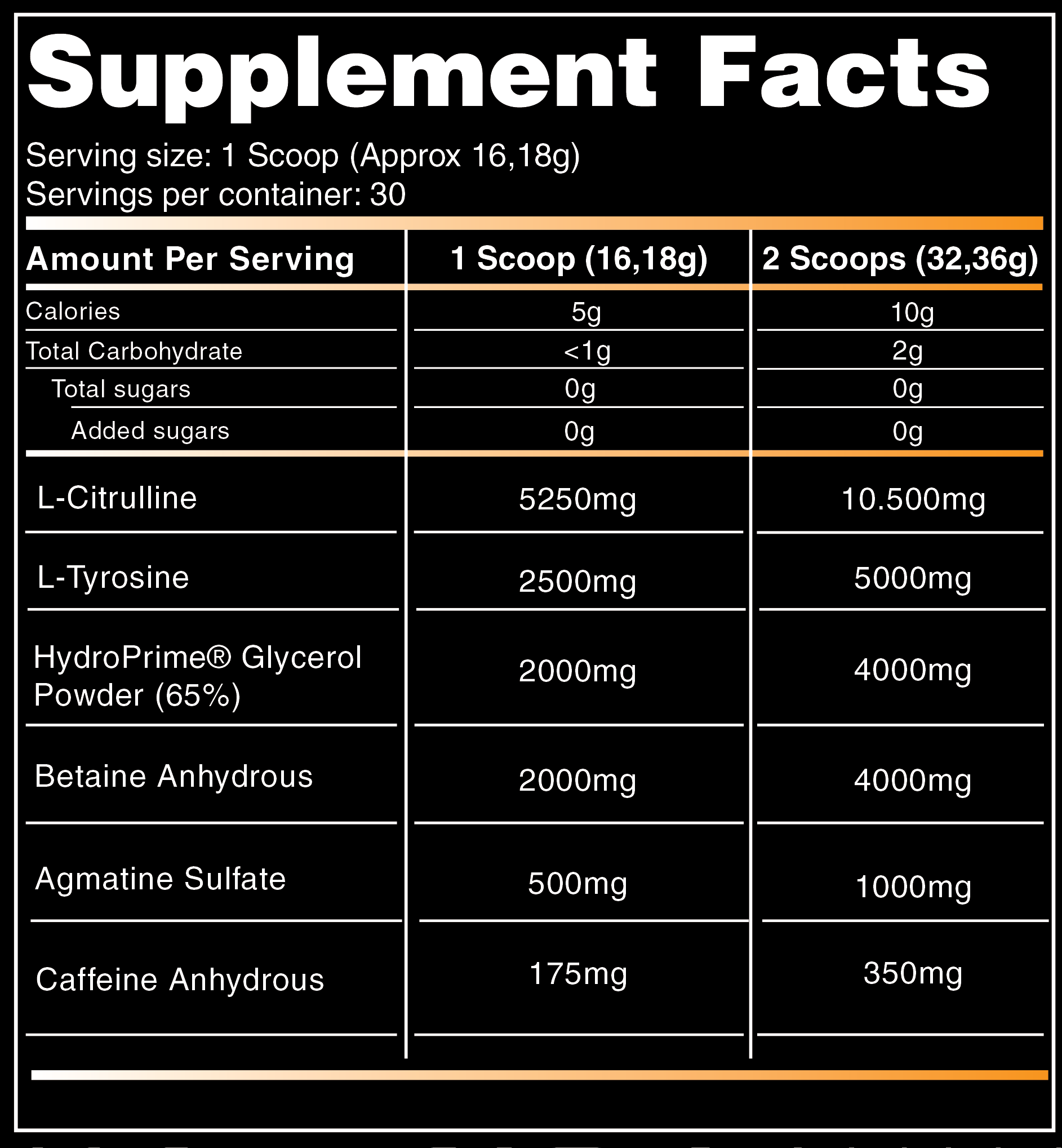 L-Citrulline and Agmatine Sulfate optimize blood flow, while Glycerol powder and Betaine Anhydrous enhances hydration, resulting in superior pumps.